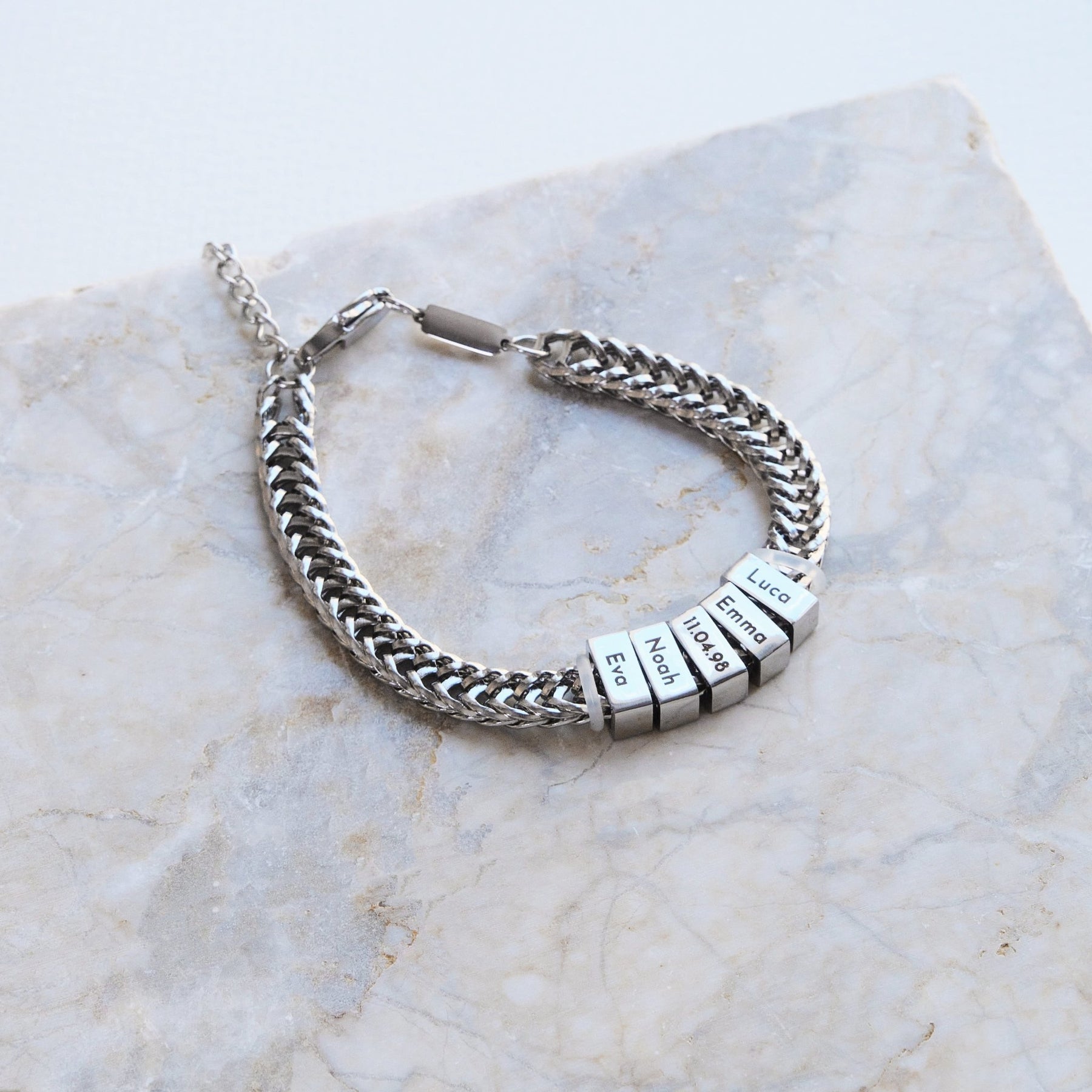 Un gioiello speciale con un significato emozionale: questo braccialetto color argento in acciaio inossidabile 316L di alta qualità non è solo un accessorio elegante, ma anche un segno di profonda connessione. I cubi incidibili offrono spazio per i nomi dei figli, dei nipoti o un messaggio personale.