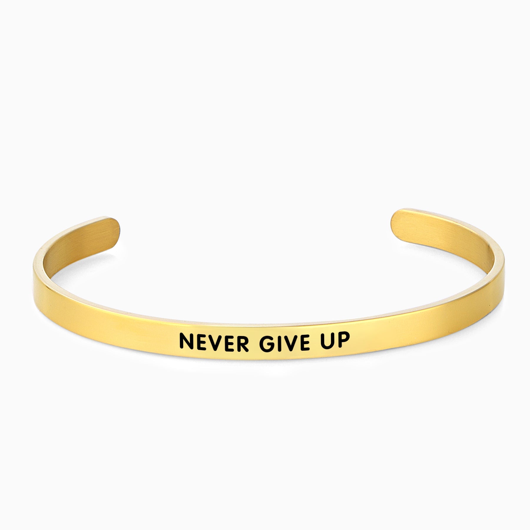 Lasciati ispirare ogni giorno dal nostro incantevole bracciale, che porta la potente frase "Never Give Up". Questo gioiello unico è molto più di un semplice ornamento lucente; è un simbolo di forza, perseveranza e fede incrollabile.