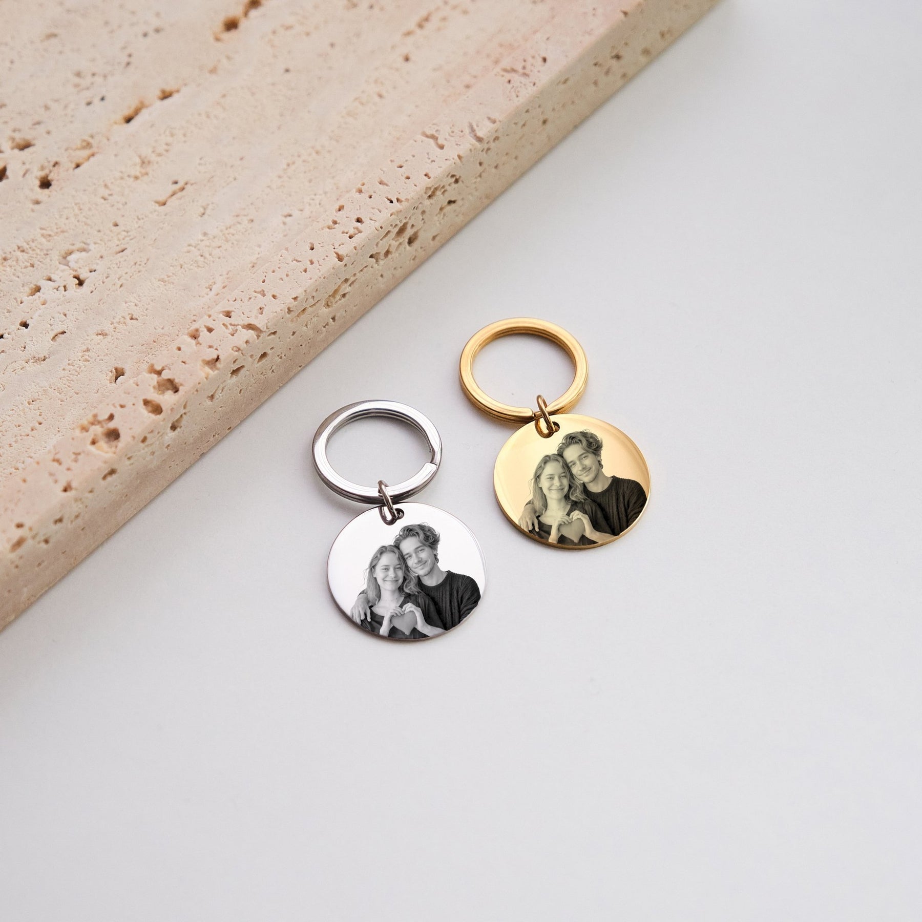 Realizzato in acciaio inossidabile 316L di alta qualità in argento, il portachiavi convince per la sua qualità robusta e durevole e un design senza tempo. La foto viene incisa in modo dettagliato e permanente, così da rimanere protetta e non sbiadire nell'uso quotidiano.