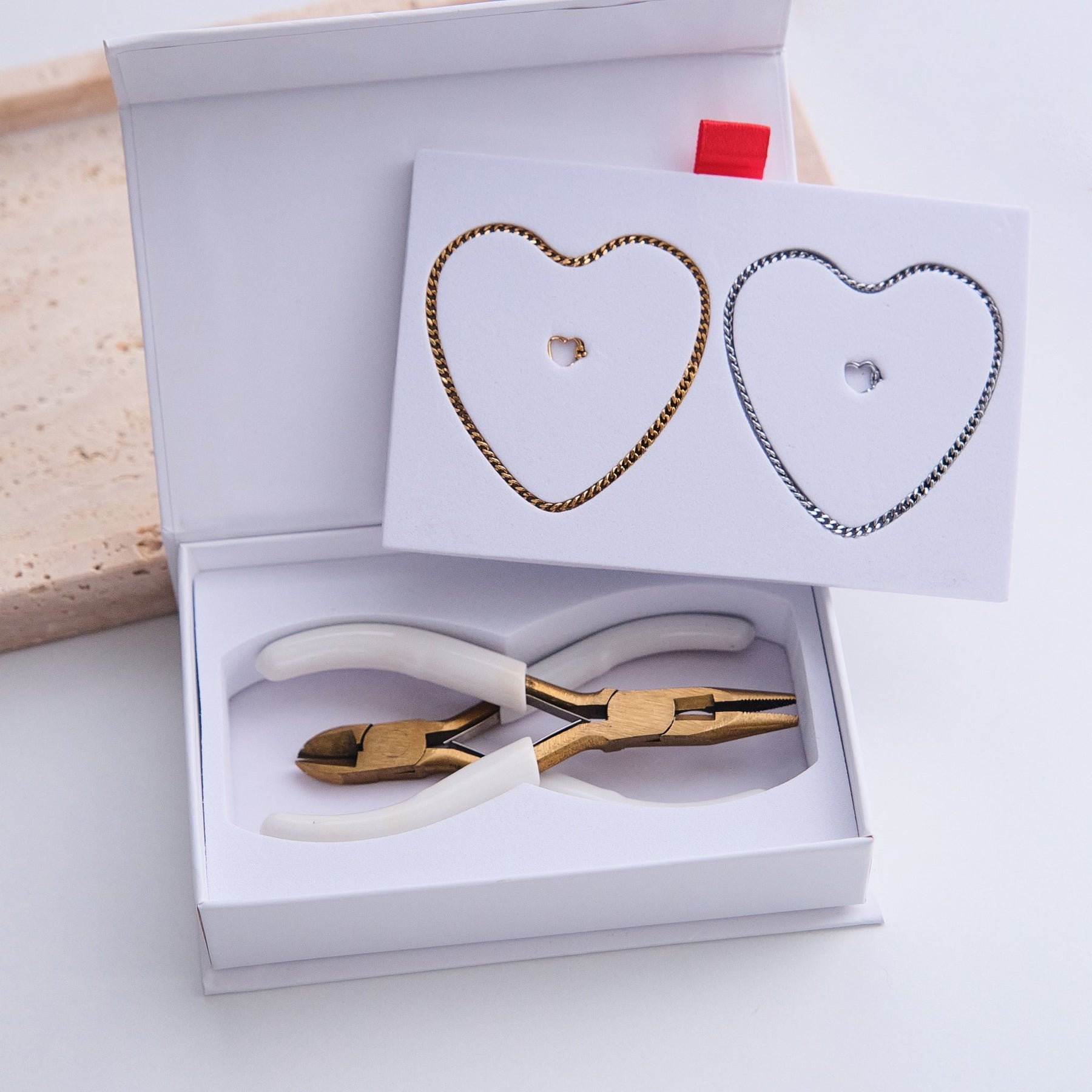Ogni set è composto da due braccialetti permanenti, due chiusure appositamente sviluppate, un tronchese per regolare la lunghezza individualmente e una pinza per una chiusura sicura.